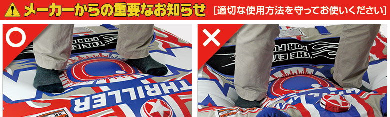 ウォータートイに適切な空気圧がないと、本来のアクションを充分に楽しめないだけでなく、ロープやフック部分、カバー、インナーチューブなどへの負担が大きくなり破損の原因になります。左の写真は大人が乗った時に表面がどれくらい沈むかを示しています。強い反発力があり全体的に2〜3cm程度沈む状態が適切です。足の周りだけ部分的に沈む場合は空気圧が足りませんので必ず空気を補充してください。電動ポンプ(ブローアー)だけでは適切な空気圧をつくることはできませんので、必ずフットポンプやダブルアクションポンプなどで仕上げ補充をするようにしてください。
