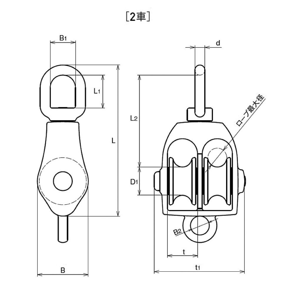 ■サイズ:(d)5、(L)80、(L1)17、(L2)49、(D1)15、(B)27、(B1)13、(B2)10、(t)14、(t1)48