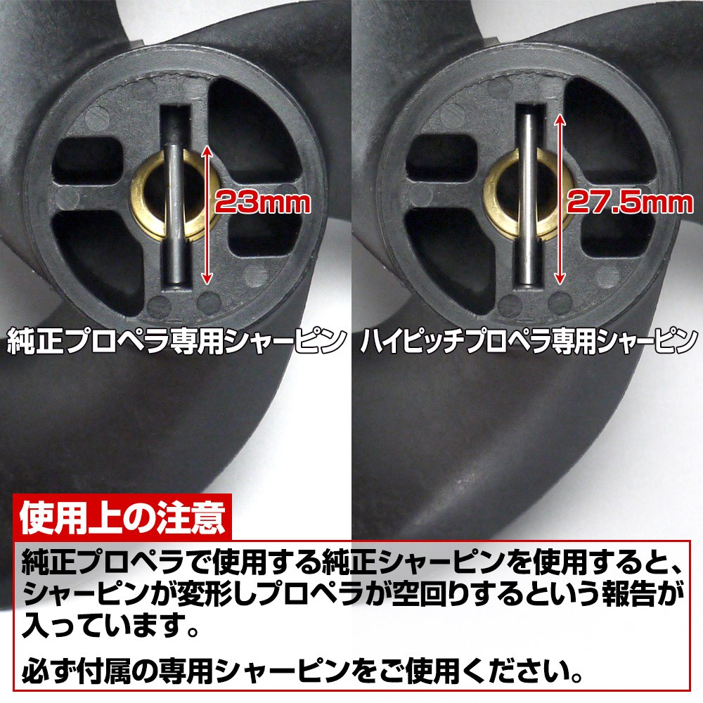 純正プロペラに使用されているシャーピンはサイズが短いため、絶対に使用しないで下さい。必ず専用シャーピン(品番:6001-073-06-P-SP)をご使用下さい。
