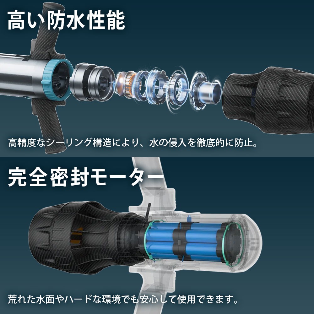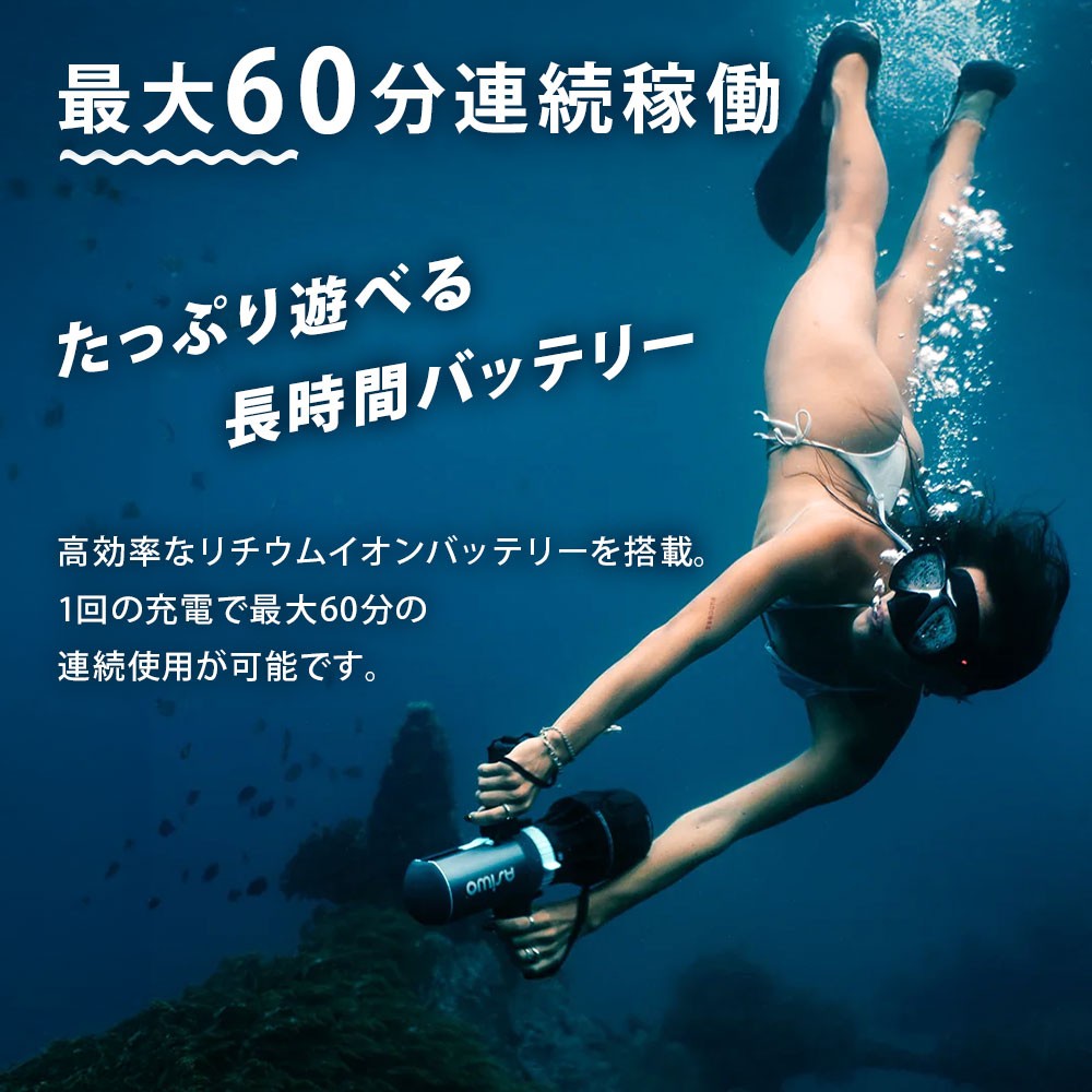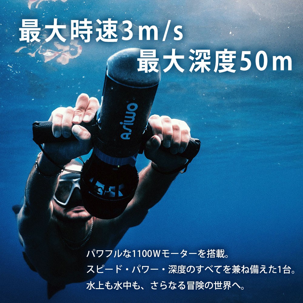 ●最大時速約10ft/s(約3m/s)、パワフルな1100Wモーターを搭載。水深最大50m(164ft)まで潜行可能で、スピード、パワー、深度のすべてを兼ね備えた1台。