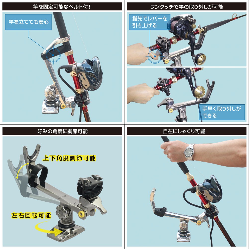 ●セットした状態でしゃくり動作もラクラクでき、手元のリリースレバーでロッドの取り外しも瞬時に行うことができます。
