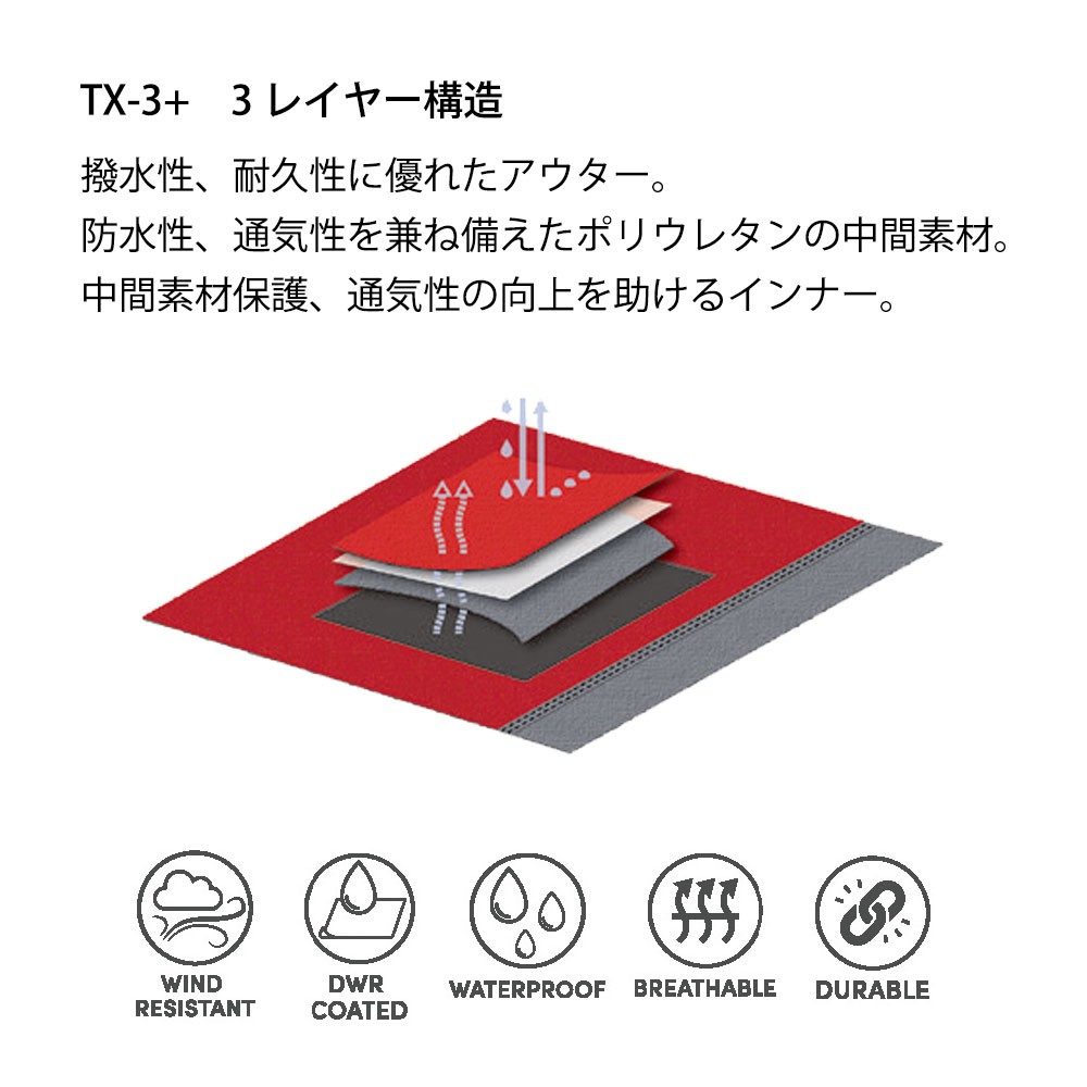 ●TX-3+ 3レイヤー構造:撥水性、耐久性に優れたアウター。防水性、通気性を兼ね備えたポリウレタンの中間素材。中間素材保護、通気性の向上を助けるインナー。