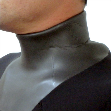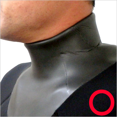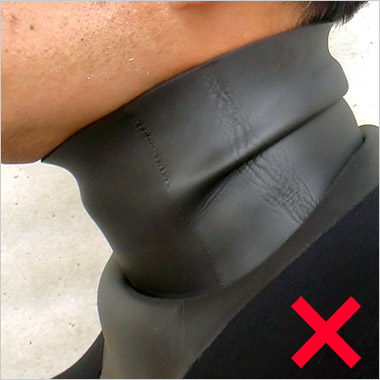 | ネック部分のネオプレンシールは、内側に折り込んで着用して下さい。そのまま着用すると水が浸入する可能性が高くなります。 |