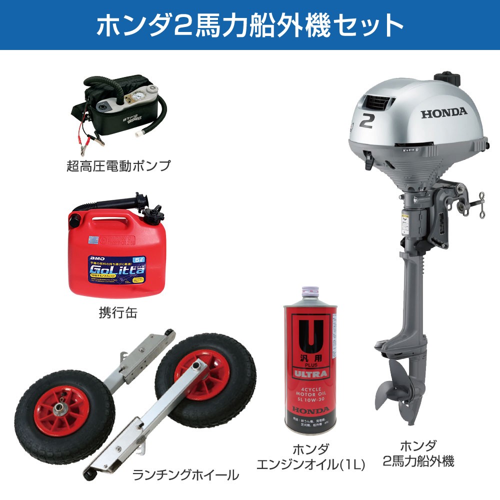 ▶ この商品について質問する■セット内容:パプリカ305(JPK-305)ゴムボート、超高圧電動ポンプ、ランチングホイールM、ホンダ2馬力船外機、純正エンジンオイル1L、ゴリッタ(5Lポリタンク)