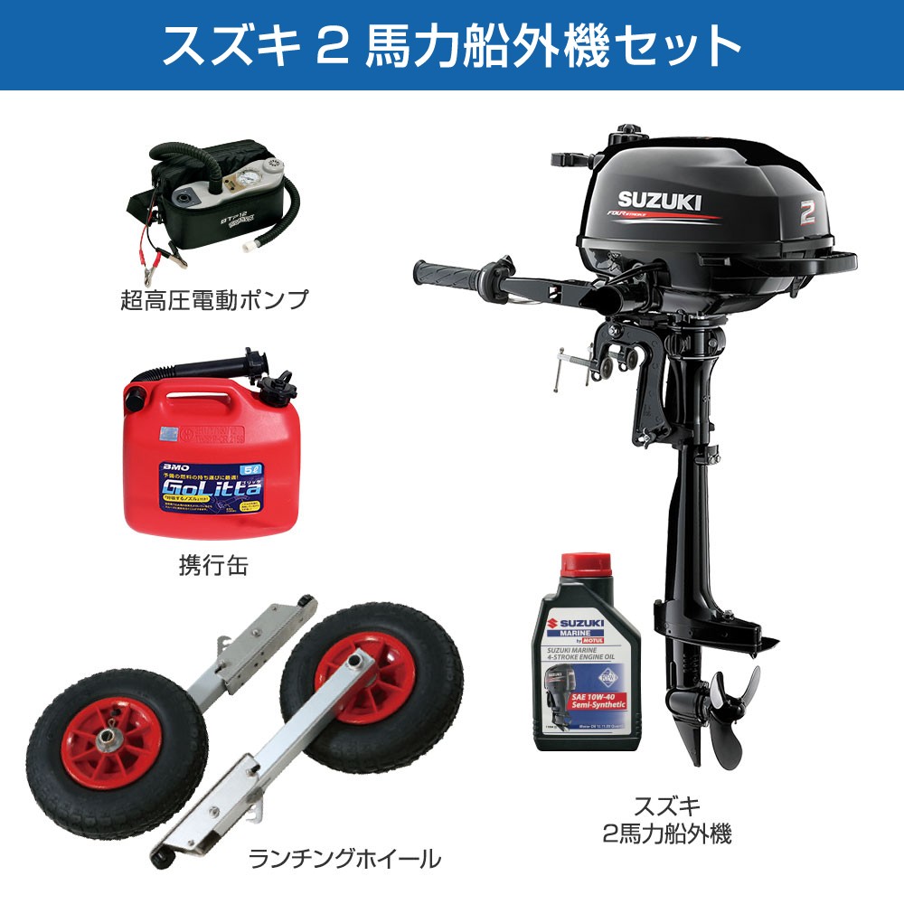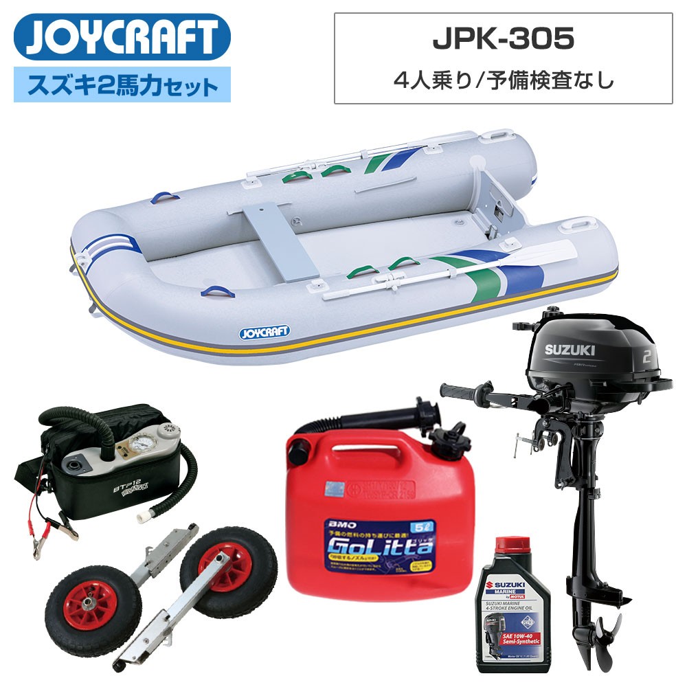 ▶ この商品について質問する■セット内容:パプリカ305(JPK-305)ゴムボート、超高圧電動ポンプ、ランチングホイールM、スズキ2馬力船外機、純正エンジンオイル1L、ゴリッタ(5Lポリタンク)