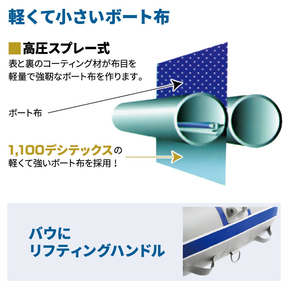 ●2馬力船外機を搭載すれば、船舶検査と免許不要で乗れる4人乗りゴムボートです。(船検免許不要ボート)