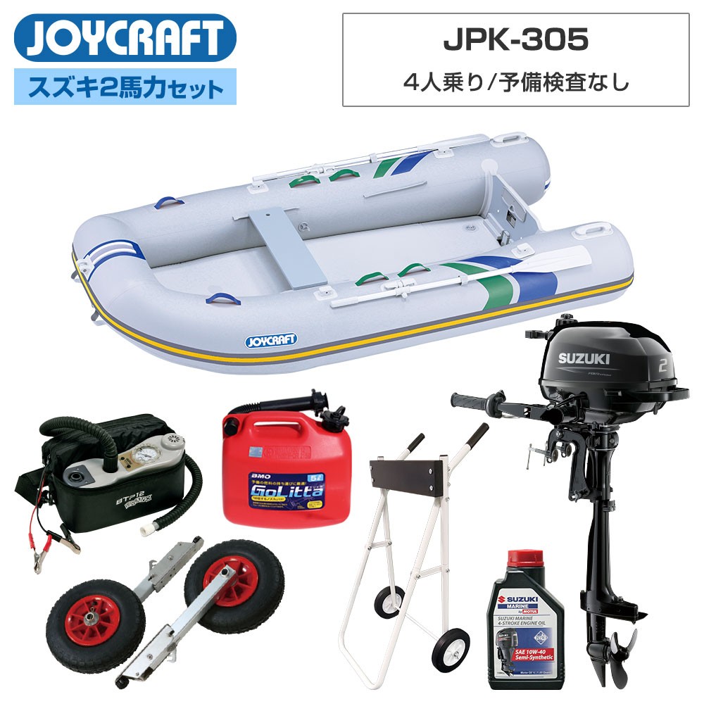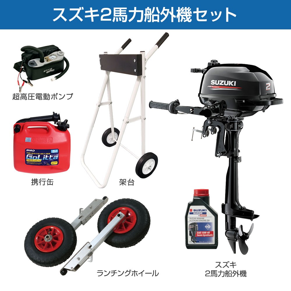 ▶ この商品について質問する■セット内容:パプリカ305(JPK-305)ゴムボート、超高圧電動ポンプ、ランチングホイールM、スズキ2馬力船外機、純正エンジンオイル1L、ゴリッタ(5Lポリタンク)、船外機スタンド