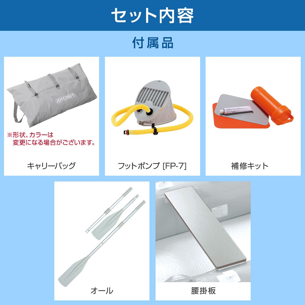 ■付属品:アルミオール、高圧フットポンプ、腰掛板2枚、補修キット、キャリーバッグ