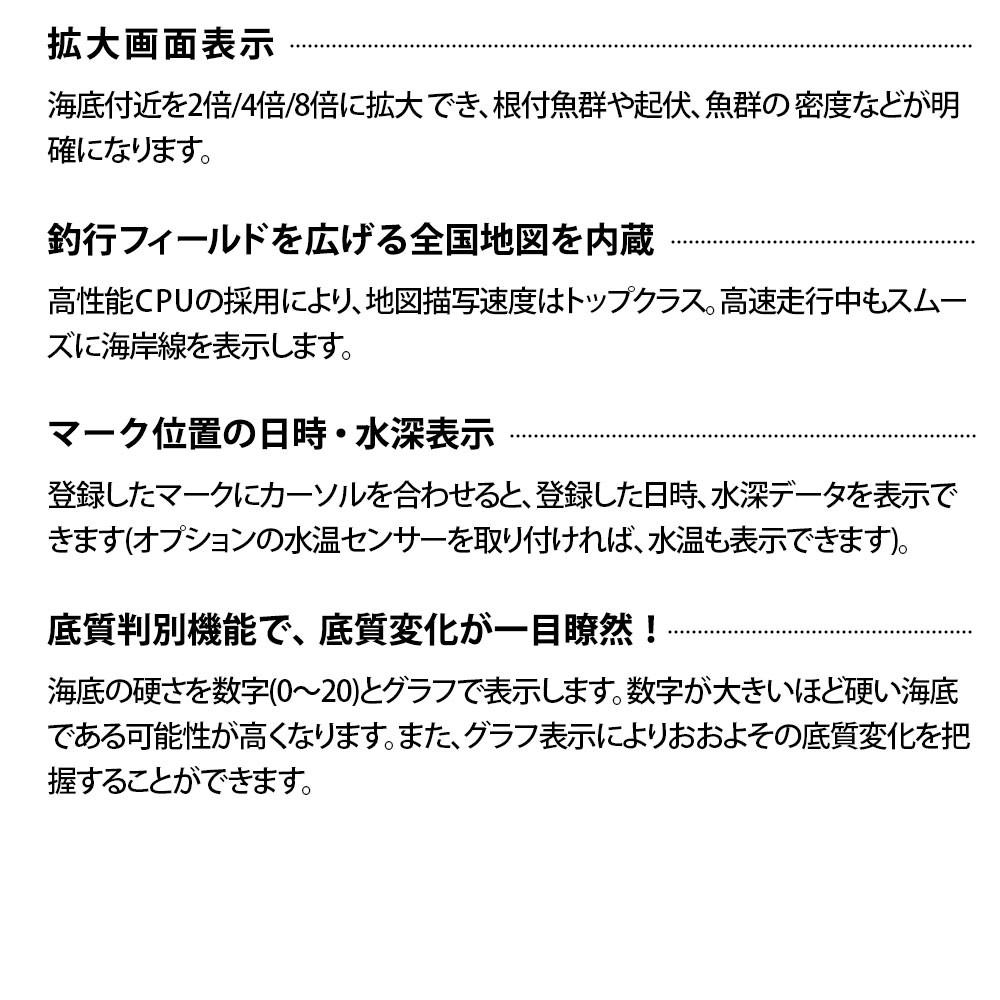 ■水深表示範囲(ディープモード時):(最大)0-500m、(最小)0-2m