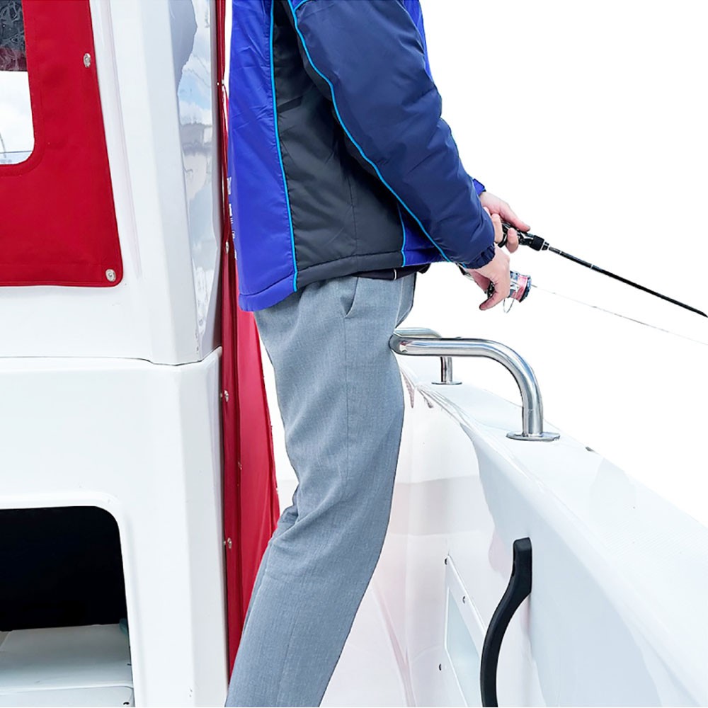 ●このハンドレールの製作のきっかけは、国産艇体に見られるブルーワーク周りが垂直の壁になっていることから、ジギング・タイラバなどの縦釣り釣りの際に、写真のように前傾姿勢での釣りを余儀なくされます。これでは長時間に及ぶ釣りで体力を消耗し、足腰にも負担が掛かってしまします。そこでこのような前傾姿勢を取る事なく、快適に釣りに集中でます。また、うねりの強い天候でも内側にラウンドしていることから、しっかりと捕まり、体を預ける事で、船外への転落を防止します。