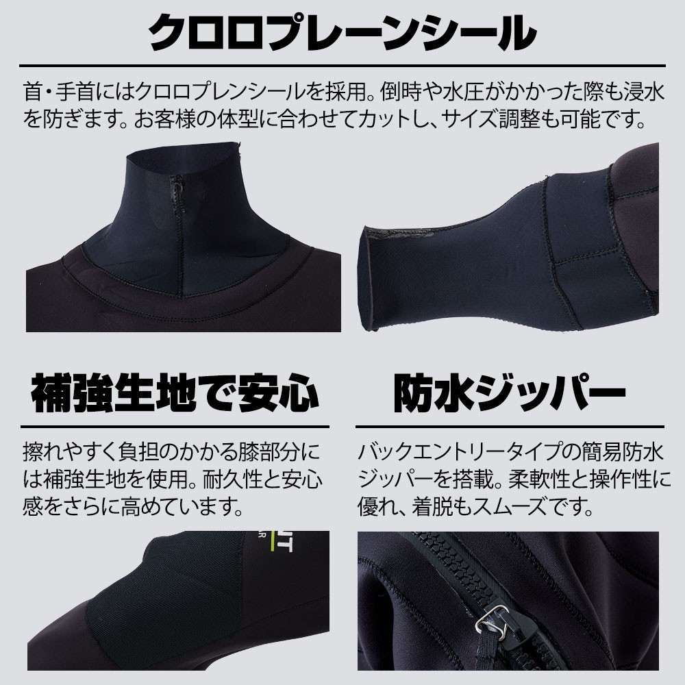 ■素材:3mmクロロプレーン、YKKアクアシール、ネックシール(クロロプレーンシー)、リストシール(クロロプレーンシール)